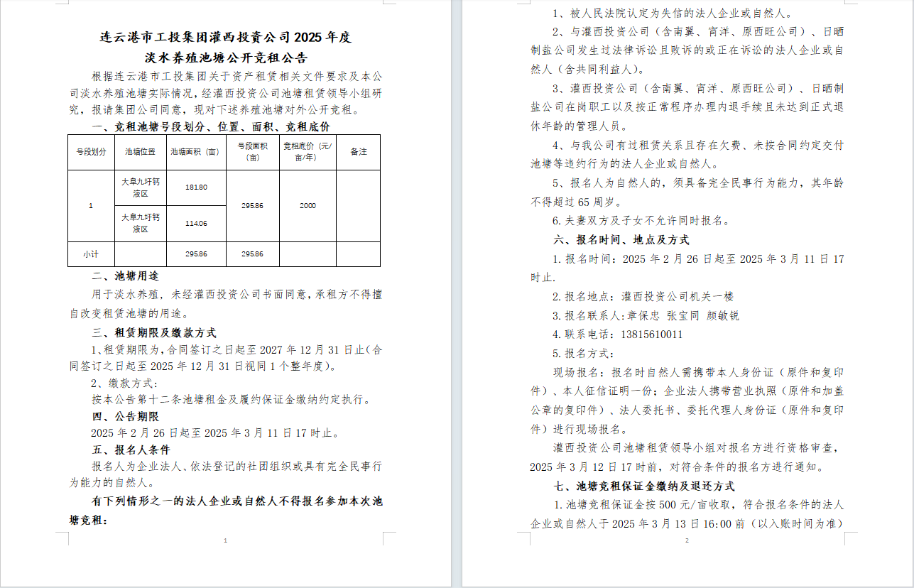 連云港市工投集團(tuán)灌西投資公司2025年度淡水養(yǎng)殖池塘公開競租公告