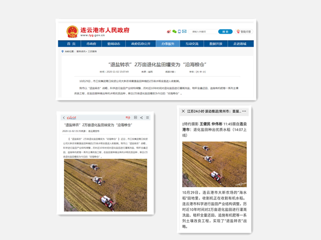 今年收割期間,人民網(wǎng)、光明網(wǎng)、江蘇24小時(shí)、連云港市人民政府網(wǎng)、連云港日報(bào)連續(xù)報(bào)道了我公司鹽堿地水稻豐收、秸稈綜合利用等工作舉措。我公司在現(xiàn)代農(nóng)業(yè)發(fā)展和生態(tài)文明建設(shè)中取得的成就受到了媒體廣泛關(guān)注。(青宣)