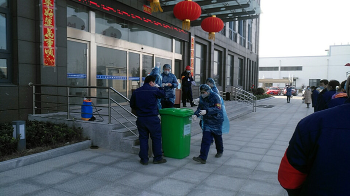 乙班班長封安帶領(lǐng)員工前往生產(chǎn)現(xiàn)場進(jìn)行消殺,對發(fā)熱員工可能出入和接觸的工作現(xiàn)場、操作臺、更衣室、原輔材料、工具等進(jìn)行徹底消毒。生產(chǎn)設(shè)備部王勇、王卉啟動調(diào)查程序,詢問其他員工,了解發(fā)熱員工行動軌跡和密切接觸情況。