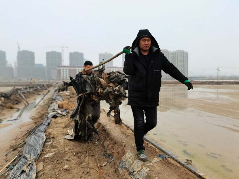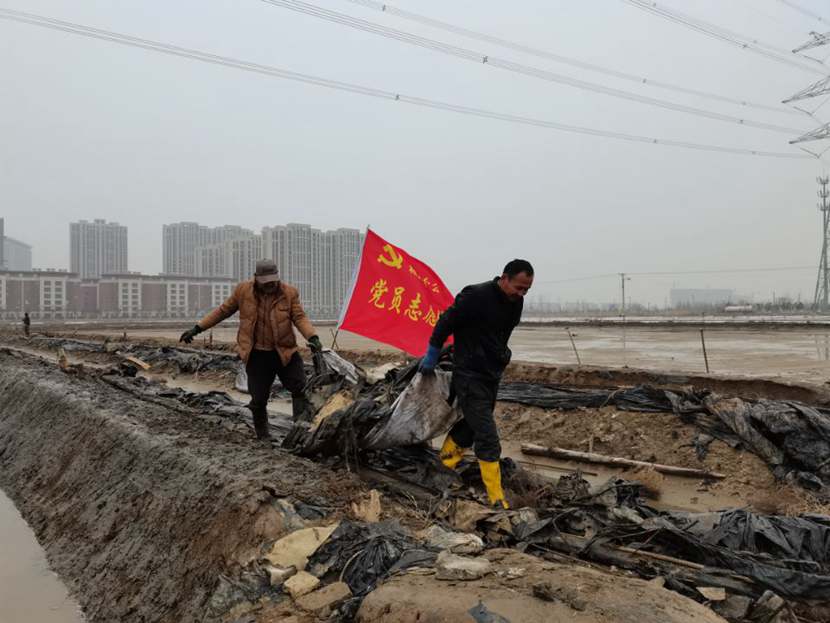 勞動現(xiàn)場,鮮紅的“黨員突擊隊”旗幟迎風(fēng)飄揚(yáng),凜冽的寒風(fēng)夾雜著細(xì)雨,絲毫不減大家的勞動熱情,個個汗流浹背、滿身泥漿,不怕臟不怕累,經(jīng)過3個小時的突擊勞動,共清理1200米、16車池埝垃圾。