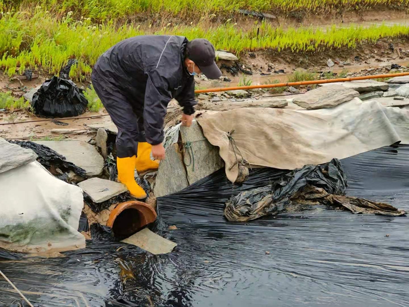 為了確保養(yǎng)殖池塘的安穩(wěn)度訊,養(yǎng)殖辦工作人員頂著大雨查看池塘水位和圍堰抗臺風情況.