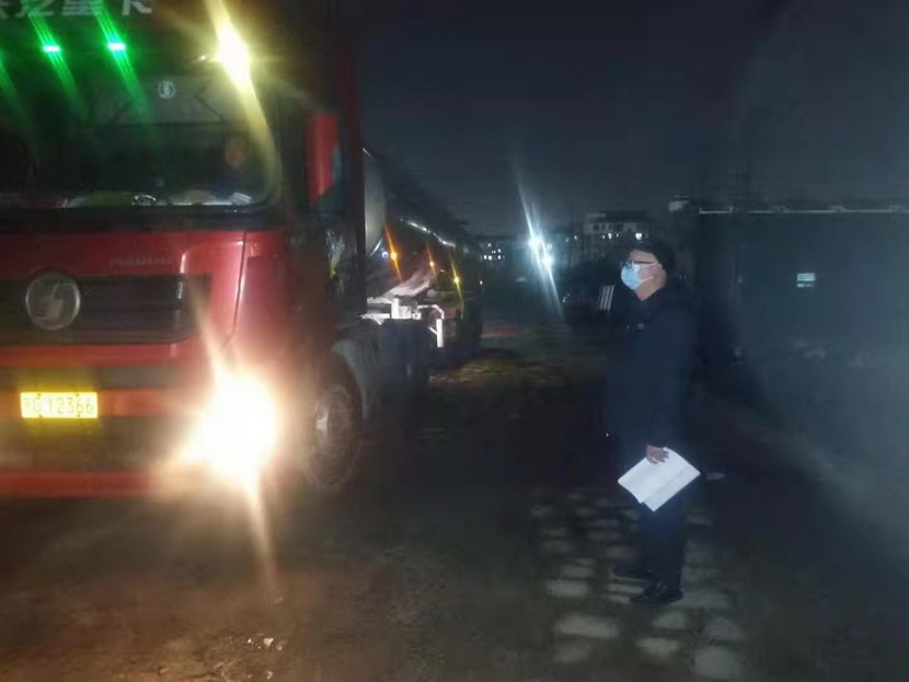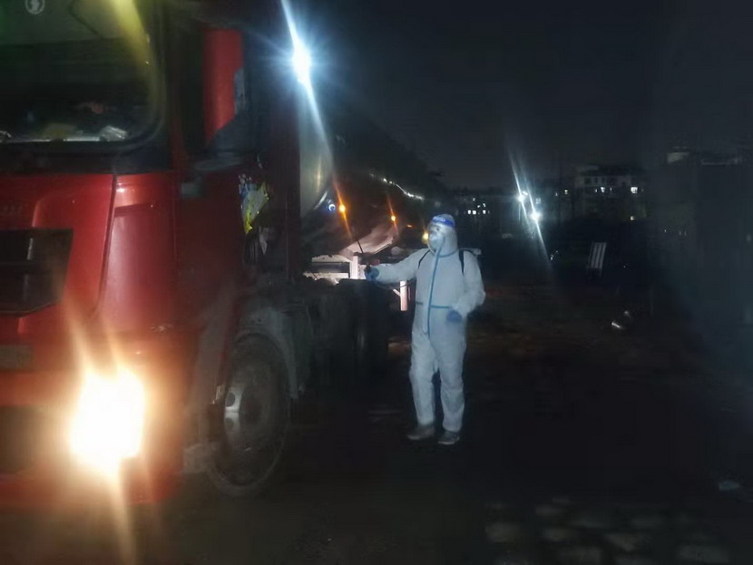 在登記信息的過程中,公司紀檢專員孫健細心的發(fā)現(xiàn)駕駛?cè)藛T的不對勁,“師傅,您看起來很疲憊,是身體不舒服嗎?”“小伙子觀察真是細致,我只是太餓了,閉環(huán)管理規(guī)定駕駛員不準離車,所以我從鹽城出來4個多小時還沒有吃晚飯?!薄皫煾担缘纫幌?,我去給您買份快餐,再給您燒壺?zé)崴?!”?dāng)駕駛員吃完快餐,鈣液車也裝貨結(jié)束,此時已是晚上9點40分,按照“方案”規(guī)定,“大白”程輝對車輛進行離場消殺,并拍攝相應(yīng)消殺照片,上傳系統(tǒng)。